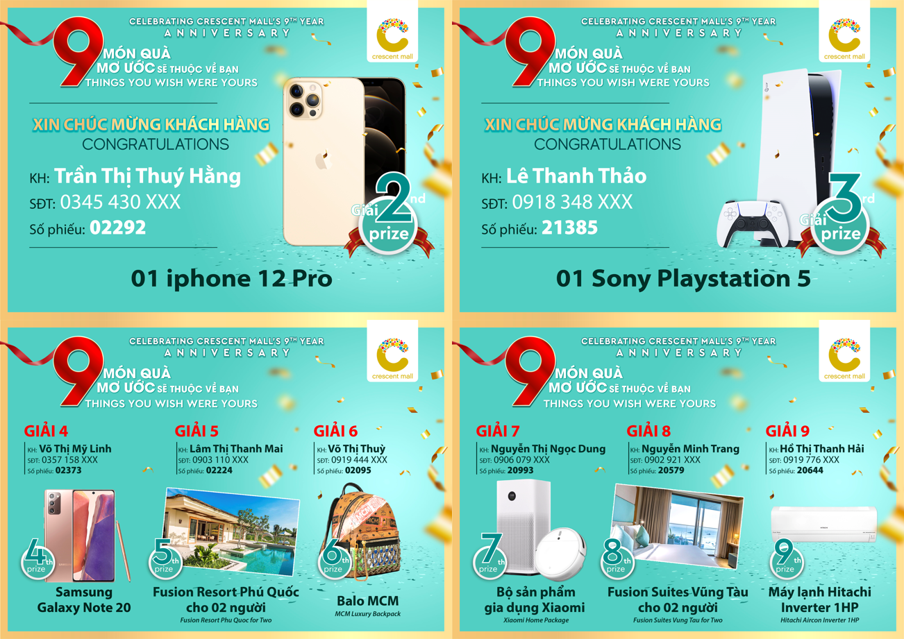 Woohoo… Crescent Mall xin chúc mừng Khách hàng may mắn sau đã thắng giải chương trình “MỪNG SINH NHẬT 9 NĂM THÀNH LẬP - 9 MÓN QUÀ MƠ ƯỚC SẼ THUỘC VỀ BẠN"